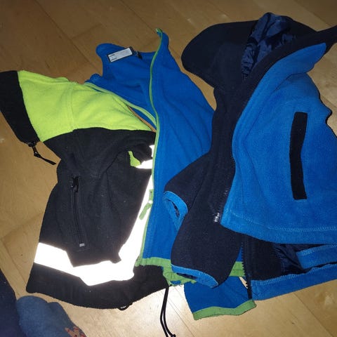 Vindfleece og regnjakke lite brukt. Blå Jakke endel brukt. Utebukse lite brukt, men mangler likevel en strikk.