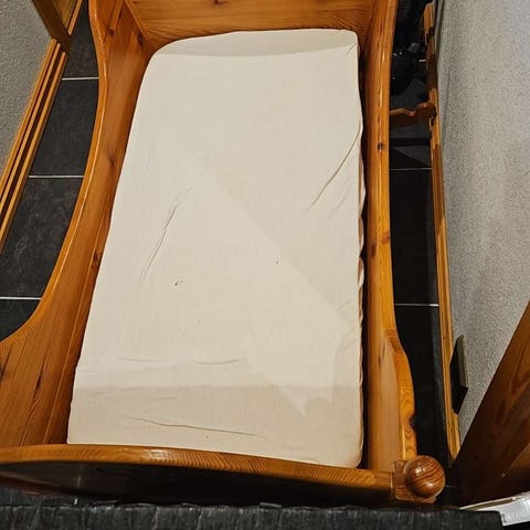 Vugge i tre, malt hvit. Pent brukt. 100 x 60 cm ca.