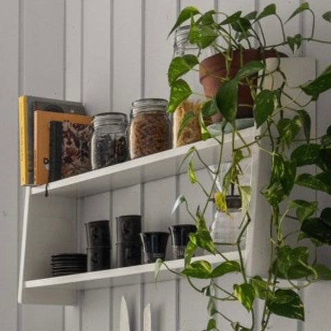 Nett og fin vegghylle med oppheng på baksiden. Spor til å holde fat eller bøker på plass.