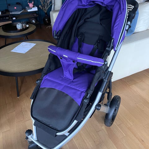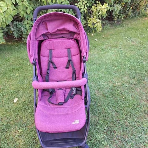 Virage barnevogn i rosa og grå farger. Vognen har et solid håndtak med koppholder, og er utstyrt med fire hjul for stabilitet. Den har en justerbar ryggstøtte og sikkerhetssele for barnets komfort og sikkerhet. Vognen er sammenleggbar for enkel transport og oppbevaring.