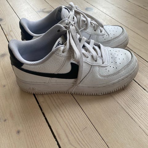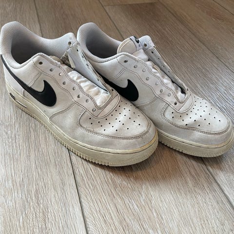 Flotte Nike Air Force 1 selges billig, da de har blitt for små for junior. Hvite sko med blå og grå stripe. Pent brukt.