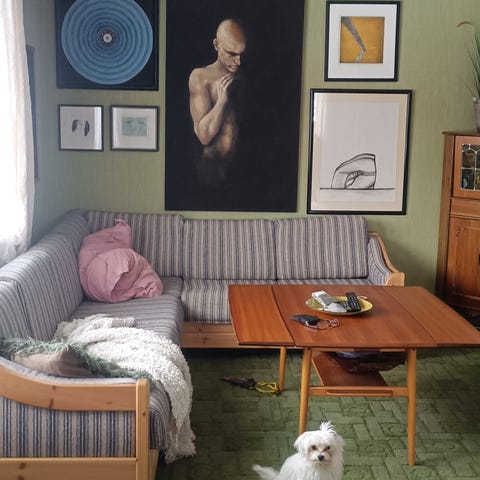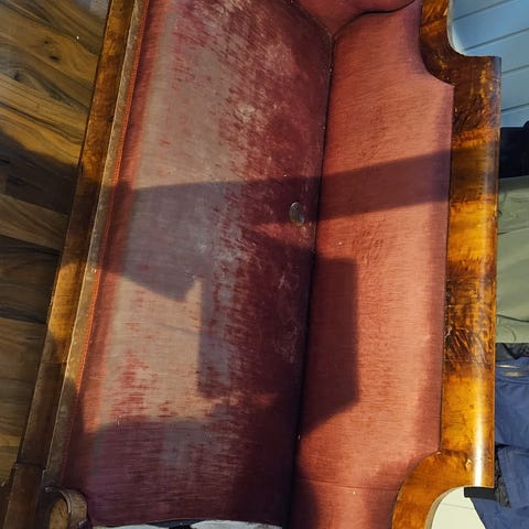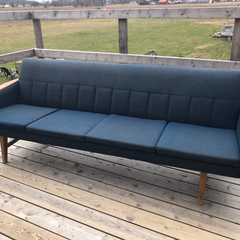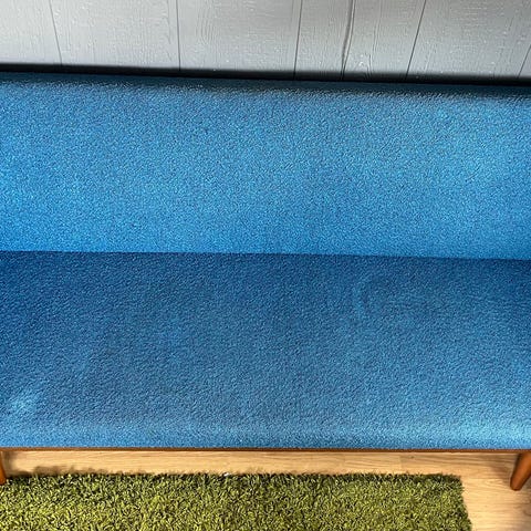 Retro sofa som dessverre var i nærheten under malejobb og har fått seg en del flekker i stoffet. Har også blitt noe solbleket. Er støvsugd, men det kan finnes kattehår i sofaen også.