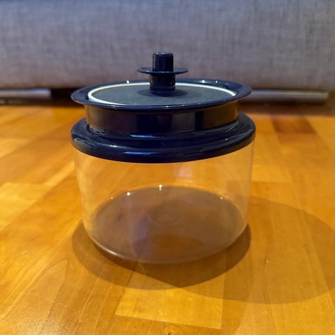 Selger en svensk plastboks / krukke med lokk, lokket er i fargen mørk blå. Der følger med en tilhørende skje