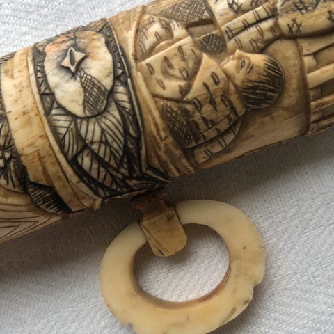 Dette er en flott antikk, trolig viktoriansk, spaserstokk med et utskåret hornhåndtak i form av en greyhound med glassøyne. Delen under håndtaket er trolig sølv, men har ikke funnet noe stempel. Selve stokken er merket Mispel, som er en tresort.