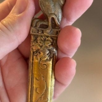 Dette er en flott antikk, trolig viktoriansk, spaserstokk med et utskåret hornhåndtak i form av en greyhound med glassøyne. Delen under håndtaket er trolig sølv, men har ikke funnet noe stempel. Selve stokken er merket Mispel, som er en tresort.
