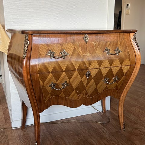Denne unike skjenken/kommoden ble kjøpt fra en profesjonell som jobber med restaurering og redesign. Den er kledd i art deco-tapet og har eksklusiv lærfôring på innsiden. Håndverket er av høy kvalitet, og møbelet er både funksjonelt og dekorativt.