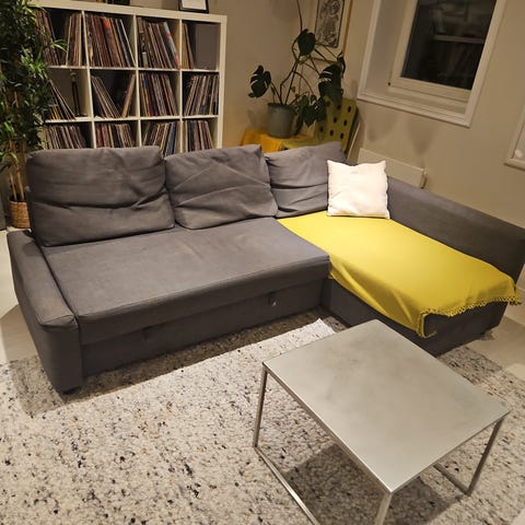 Svart sovesofa som kan slås ut, det er en hel sovesofa uten at man trenger og legge til ileggsputer. Lite brukt. Må hentes. Ca 2 meter lang når den er slått ut☺️