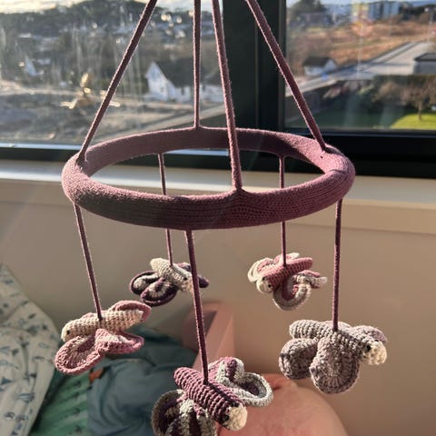 Denne hengende uro har søte heklete traktorer i blå og grå nyanser.