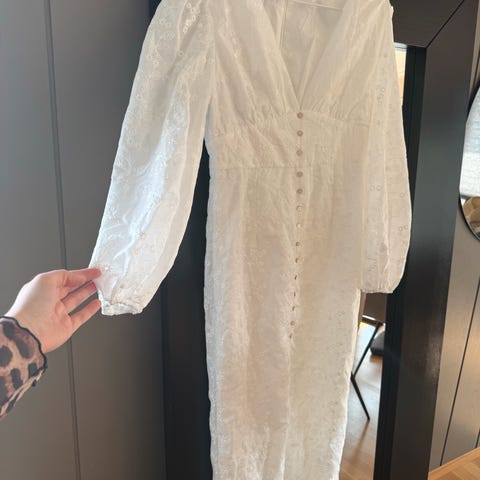 Camilla Stenberg sommerkjole i hvit farge og størrelse XS. Kjolen har et delikat design med lange ermer og detaljer i blonder. Perfekt for sommerlige anledninger.