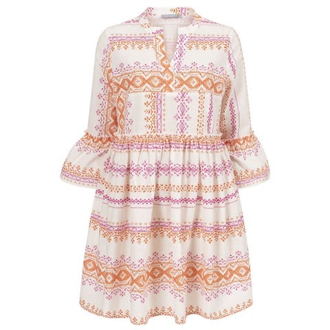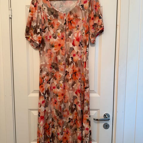 Lekker sommerkjole med flott trykket mønster i lett bomullskvalitet. Lite karge og v - utringning i front og lagdelt voluminøst skjørt. 3/4 lange trompet ermer og knelengde. Reguler fit. 100% bomull.