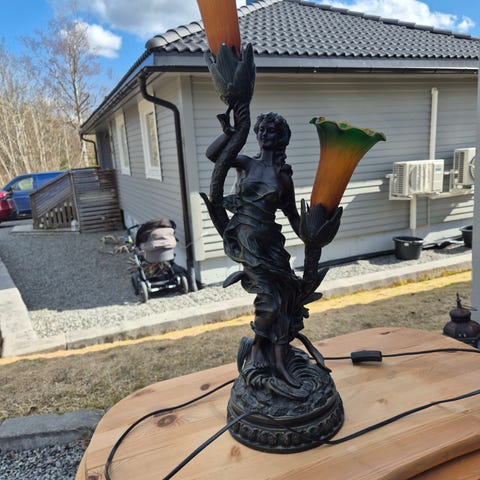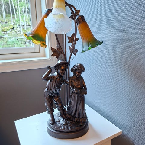 Vintage bronse bordlampe med skulpturmotiv. Lampen har en intrikat utformet skulptur av en kvinne og et barn, og gir et klassisk inntrykk. Skulpturen fungerer som lampefot og har en unik kombinasjon av kunst og funksjonalitet.