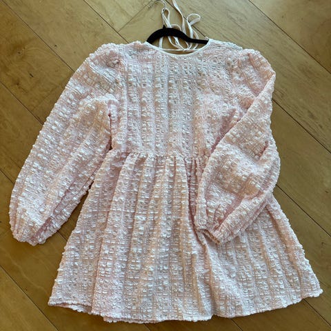 By Malina festkjole i størrelse S. Kjolen er rosa og designet for kvinner. Den har lange ermer og et elegant mønster, perfekt for spesielle anledninger.
