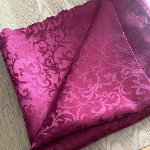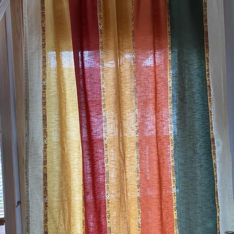 Den er: 184 cm x 92 cm, og lengdemålene er UTEN frynsene, så det må du legge til lengdemålet. Den har hengt på vegg, med en gardinstang i en kanal som jeg har laget. Den har hengt oppe i 3 år, og vært pakket ned i 30 år :-) (Ikke røykehjem)
