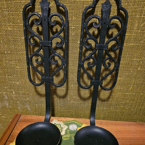 Selger et nydelig sett med to veggmonterte lysestaker i solid, svart smijern. Disse har et romantisk og rustikt design med elegante hjertesnirkler og vakre detaljer. Perfekte for å skape en lun, stemningsfull atmosfære i stue, gang, hytte eller uteplass!