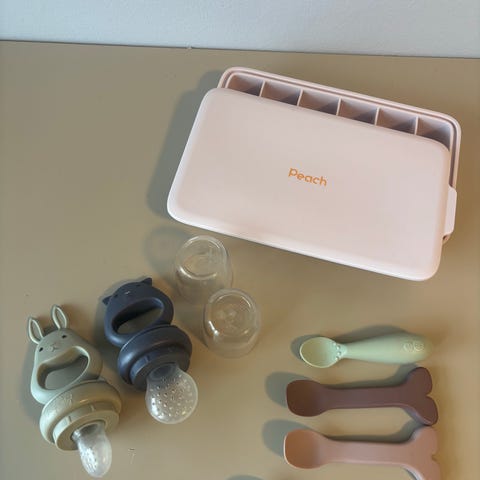 Kjekk skje som kan fylles med grøt / smoothie eller lignende også presser man maten ut på skjeen. Greit når man er på farten og har lagd mat selv.