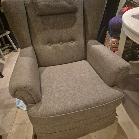 Lenestoler og puff kjøpt fra trademax i slutten av 2023. Er i god tilstand, den ene lenestolen og puffen bør få en liten vask. Ellers veldig fine møbler, men fargen passer ikke lenger for oss med småbarn.