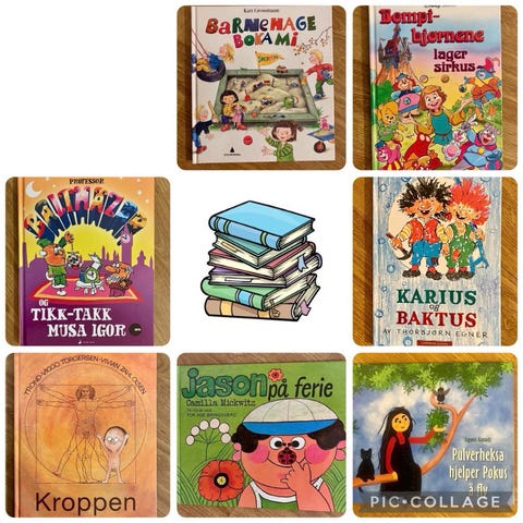 En samling av fem barnebøker med illustrasjoner og innbundet format.