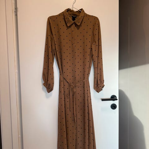 Herlig prikkete kjole. Kjolen har knyting i halsen og rindt livet. Den er mer korall i fargen enn rosa, og er str S. Virkelig nydelig.