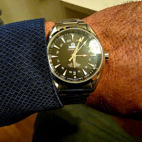 Omega Railmaster med nydelig denim skive med oransje sekundviser og railmaster logo, med flott fargespill, 40mm, tatt ut 20/02-24 hos AD i utlandet.