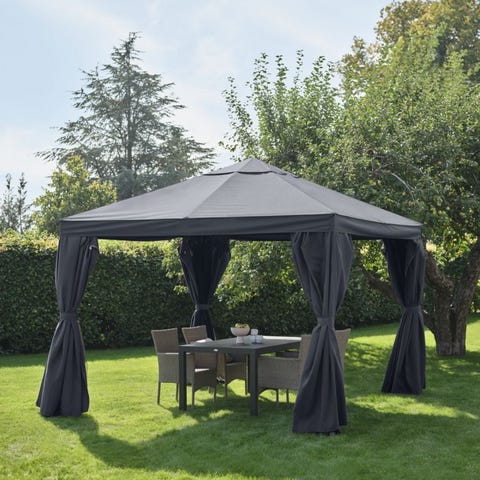 Hagemarkisen er laget av UV- og vannbestandig polyetylenmateriale, og er derfor veldig praktisk for utendørs bruk. Rammen er laget av rustbestandig stål, noe som gjør utemarkisen stabil og holdbar. Festteltet har sidevegger, hver med dekorative vinduer, og 1 sidevegg med dør med glidelåsåpning for enkel inngang. Hagepaviljongen er lett å montere.