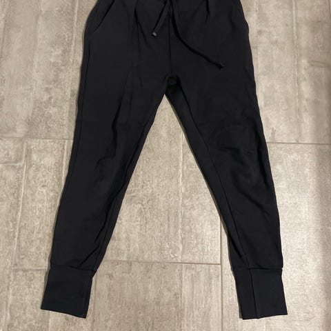 Pen «joggebukse» med litt stretch. Stikklommer foran og bak, strikk i livet med knyttebånd. Kan brukes både til fritid og dresset opp.