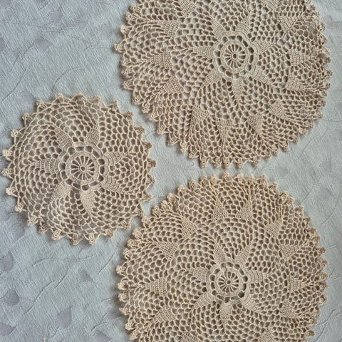 Disse søte brikkene er heklet med garnet Dixi (mercerisert bomullsgarn) Heklekrok 1,25.