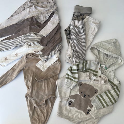 Klespakke i størrelse 74, i hovedsak av merkene name IT og H&M.