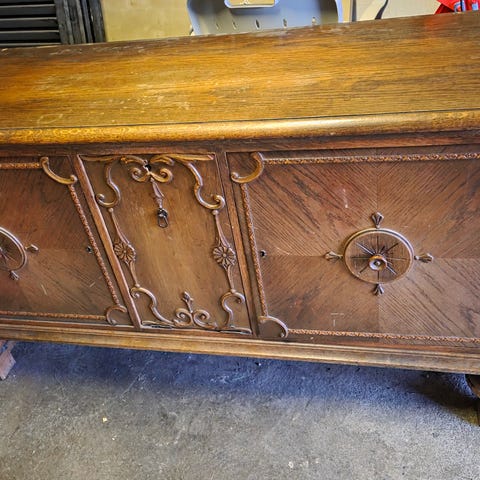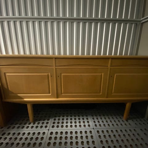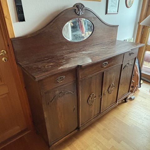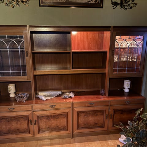 Veggseksjon dvs. skjenk og separat hylle over, selges. Veggseksjonen er kjøpt i 1976. Den er i eik, men er så vidt vi kan se ikke heltre, men allikevel solid. Består av 3 moduler hver på 84 cm. Skjenken er 74 cm høy og 44 dyp med avtagbare ben, mens hyllene er 115 cm høy og 34 cm dype. Lagt opp til lys i midtseksjonen. Blyglassvinduer i hyllesystemet.
