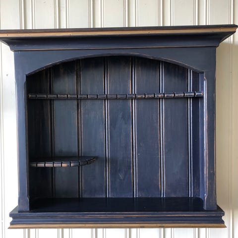 Skapet var opprinnelig syrelutet/furu. Det er nå vakkert malt i dempet sort, og hvitt inni. Skapet er bygget uten spiker og skruer. Innfelt glass i hver rute.