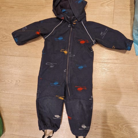 Softshelldress fra Name it i str 104. Dressen er godt brukt, slitt ved ermer, nederst på beina og ved sømmer. Reparasjonslapp på ene kneet og bak. Se bildene. Selges derfor rimelig. Fotstrikkene er intakt.