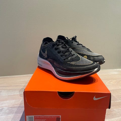 Selger mine Nike ZoomX VaporFly NEXT% Ekiden White Racer Blue. Størrelse 37,5/US 5 (Unisex størrelse). Kjempegode konkurransesko som sitter godt på foten. De har et responsivt ZoomX-skum og karbonplate. Brukt rundt 110-130 km. Pent brukt og ingen hull eller skader, men merk at Nike logoen har skallet litt av på den høyre skoen.