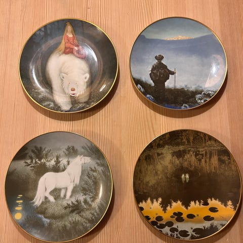 Vi selger våre pyntetallerkener og pyntekrus med motiver av Theodor Kittelsen. Se bilder for å se hvilke vi har. Vil gjerne ha kr 200 per krus, 100 kr per tallerken og kr 150 for den store tallerkenen.