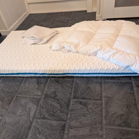 Her selges madrass med madrassbeskytter, 2x tisselaken og 1 vanlige laken til madrassen samlet.