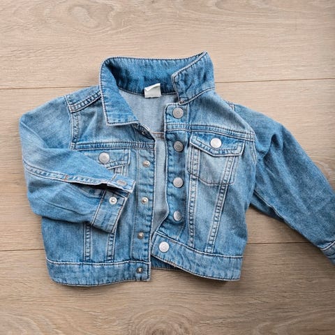 Ubrukt da den ble avglemt av oss og den er nå for liten. Fin og deilig i stoffet, ikke stiv som mye dongeri er 😊