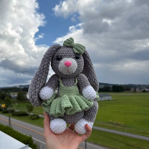 Denne unike og myke kosekaninen er nøye håndlaget av høykvalitets, plysj garn. Den er kledd i en nydelig rosa jordbærdrakt med hette og liten veske – perfekt for både barn og voksne som elsker søte og unike håndlagde produkter.