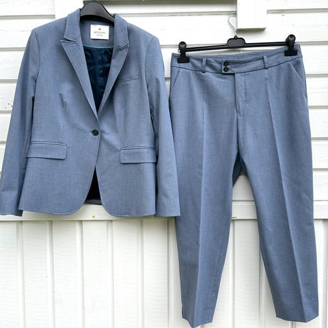 Fin dress til dame, blazer og bukse. Nydelig mørk blå farge med litt glitter. (Det er samme farge på bukse og blazer, litt dårlig farge på bildet) Fin til jobb og fest.