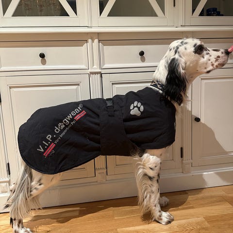 Overall til whippet eller annen slank eller medium mynde. 60 cm rygglengde. Kjøpt på Etsy. For liten for min greyhound på 31 kg.