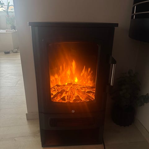 Pent brukt sort frittstående elektrisk peisovn selges.