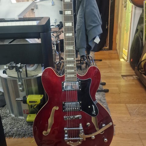 En lite brukt Epiphone Dot Studio WS. Kjøpt i USA i 2012 av broren min. Har ligger ubrukt store deler at tiden siden da pga en dårlig kobling som lå har blitt fikset. Har noen skraper og merker etter lagring, men er en veldig pen gitar fordet!