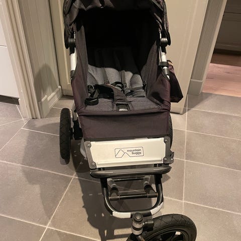 Mountain Buggy barnevogn i beige. Godt brukt. I det siste som sovevogn i barnehage (har fungert utmerket til det). Hjula er ganske slitt og det er en stein i et av dem som rasler. Hull i plast-vinduet i kalesjen er teipa. Babybag følger med.