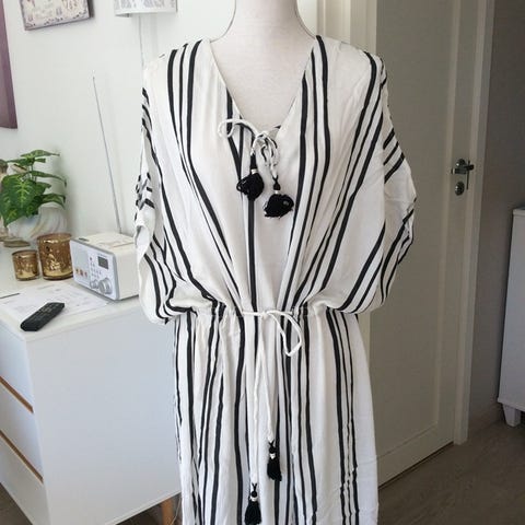 Kjole som er fin å slenge over seg på stranda. Splitt i sidene. One size. En kjole som kan pyntes opp, og brukes til mange andre anledninger også. 100 % polyester