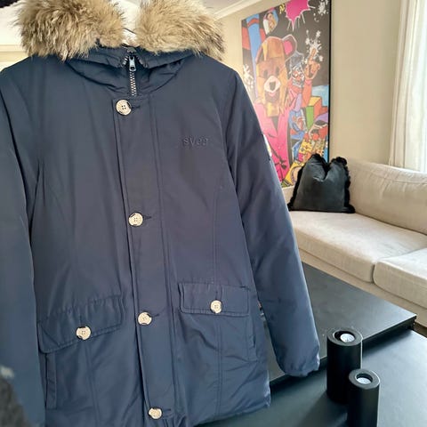 Superfin og varm jakke fra Svea. Ekte pels, men den kan tas av. Praktisk innerlomme og innstramminger på innsiden. Nederste knapp er ødelagt (se bilde), men får lukket hele jakken med glidelåsen :)