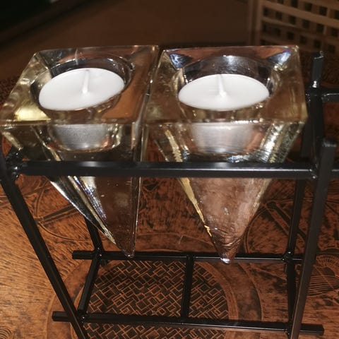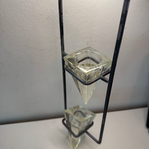 Ukjent te-lysholder laget av metall og glass. Designet med en firkantet glassbeholder for te-lys, støttet av en metallramme. Passer for innendørs bruk som dekorativ belysning. Høgde ca 22 cm. Liten skade.