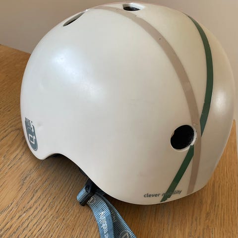 Godt brukt hjelm fra Scoot and Ride. Den har en del bulker og tapen på borrelåsen på innsiden har løsnet på fremsiden, men henger fortsatt greit.