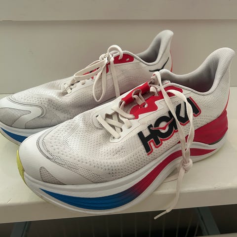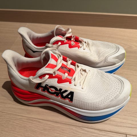 Pent brukt Hoka Skyward X, kun brukt til intervaller på mølle og løpebane. Litt kosmetisk slitt på innsiden av begge sko, se bilde, men gjør ingenting med løpsfølelse og bruk av skoa. Selger for den er for smal for min fot. Nypris 3299. Kan sendes