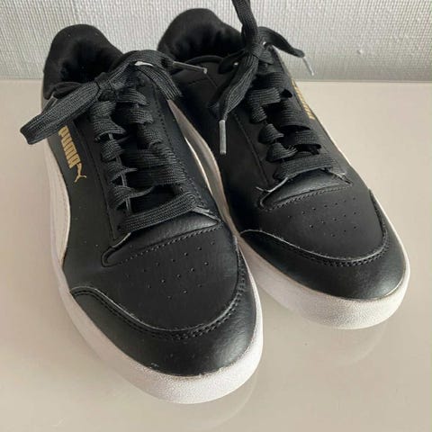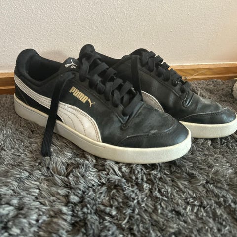 Lite brukt Puma sneakers. Blitt noen merker de få gangene som er brukt, se bilder. Men ellers en sko som ikke er gått inn. Svart skinn. Str. 37