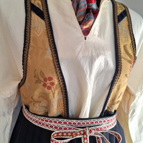 Med bunadsull I stakken og ullbrokade i livet. Forkle i syntetisk kvalitetsstoff. Ikke sydd sammen ennå, Kan tilpasses ulike størrelser. Skjorte i ekte silke 1500 kr. Gi bud!