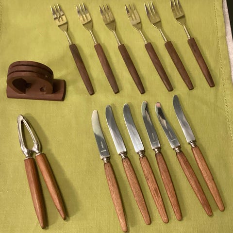 Lot med 6 stk diverse teak- og palisander retro kjøkkenbestikk