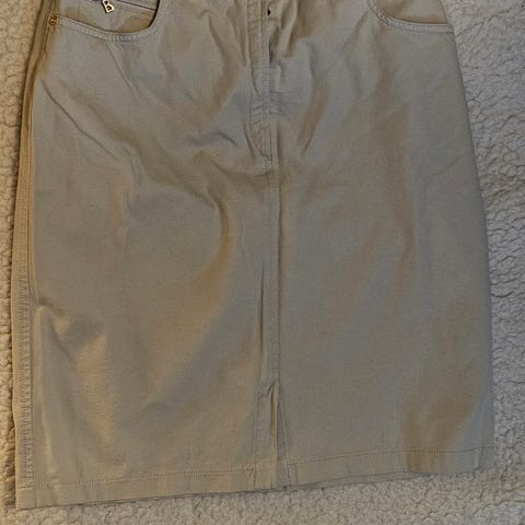 Nydelig Bogner-skjørt i bomull selges. Foret. Lommer og pyntebelte m gulldetaljer. Glidelås i siden. Romslig. Jeg bruker ofte str 40, og dette passer. Farge: lys beige, Kun brukt et par ganger.