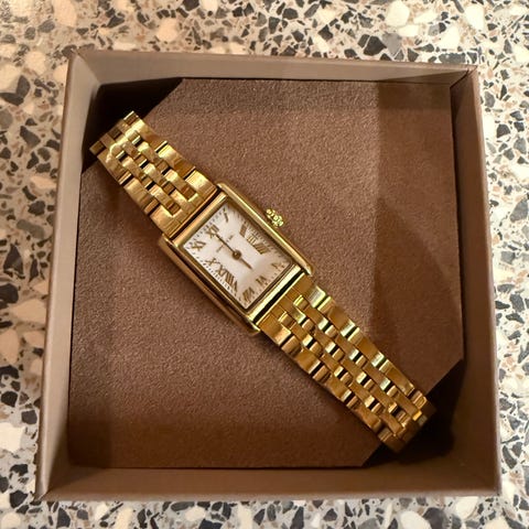Klokken har en elegant design med en svart urskive og en mesh-rem i metallisk farge. Passer til både formelle og uformelle anledninger. Kjøpt på Bjørklund.